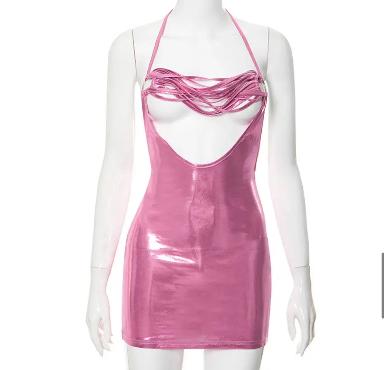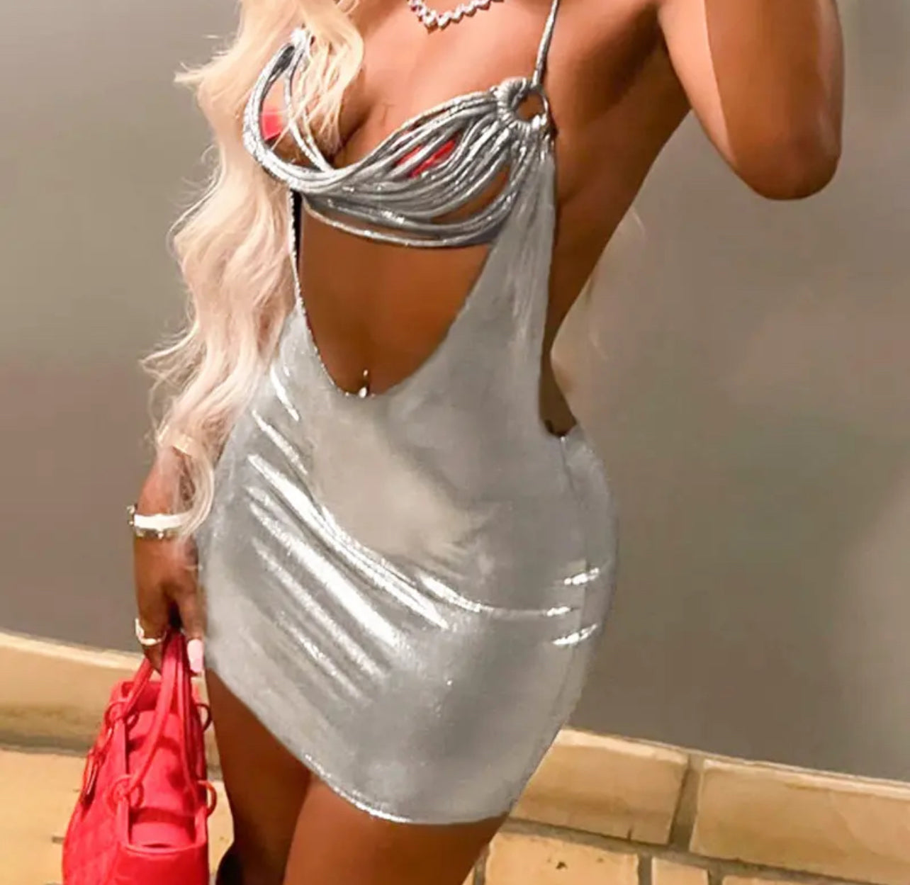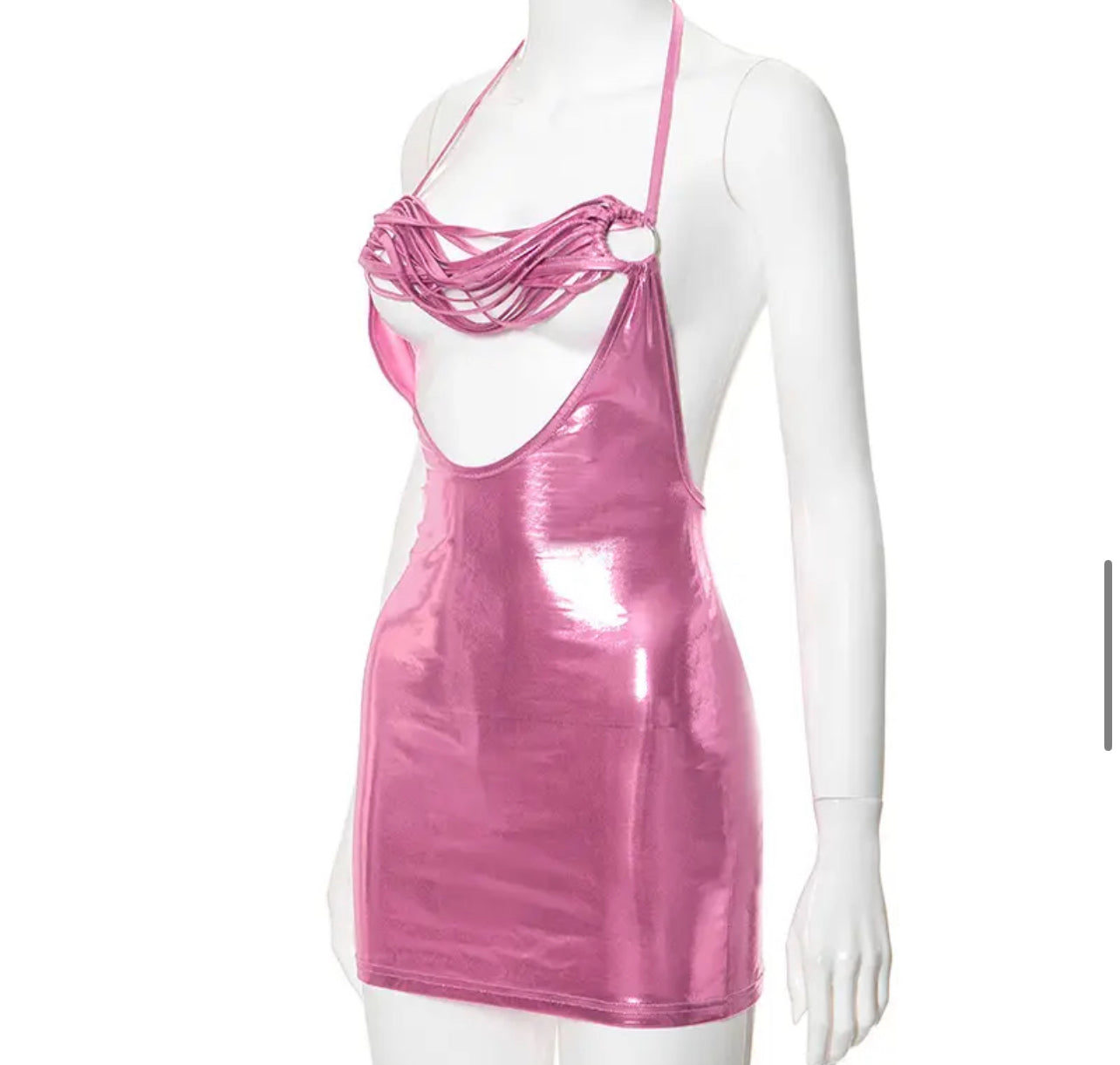Ready to have all eyes on you?? I know I am! Let’s show this season what we’re working with baddies!! This chrome bodycon dress is everything!! Halter neck adorned by open o neck straps, high stretch, short length and true to size. Matching rhinestone nipple covers included with each dress. Poly/spandex material