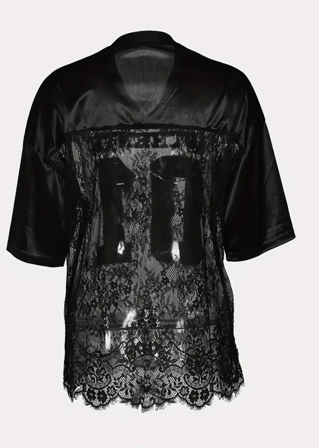 Get in the game with this sexy football jersey. Lace and satin-like jersey will have you standing out in a crowd. Runs more fitted than oversized, not much stretch, poly/elastane material and soooo cute!